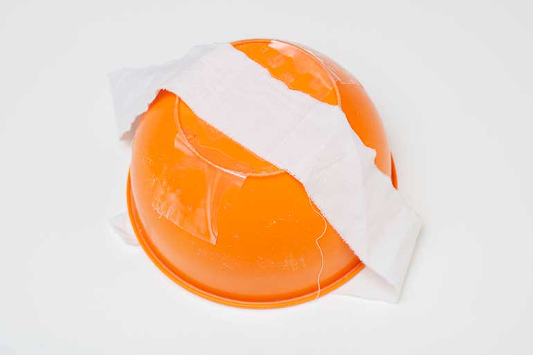 1. Für das Gespenst klebt einen Streifen Stoff mit Paketklebeband unten an die Schüssel. Die beiden offenen Enden verknotet ihr, sodass ein Stoffhenkel entsteht.