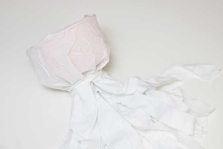 2. Legt ein großes Stück Stoff überlappend um die Schüssel und befestigt es mit Heißkleber. Reißt einen weiteren Stoffstreifen ab und bindet damit den Stoff unterhalb der Schüssel ab. Reißt oder schneidet den herunterhängenden Stoff in Streifen.