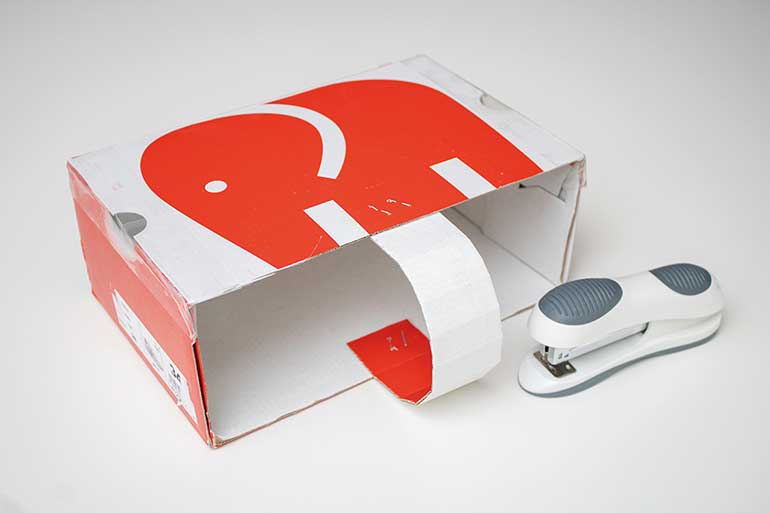1. Für den Spinnenkorb klappt ihr den Deckel des Schuhkartons auf und schneidet die an drei Seiten überstehende Pappe des Deckels ab. Dann schneidet ihr eine der schmalen Seiten des Kartons ab und legt sie beiseite. Klebt den Deckel am Karton fest. Schneidet aus der herausgeschnittenen Pappkartonseite einen Streifen zu und tackert ihn als Griff fest.