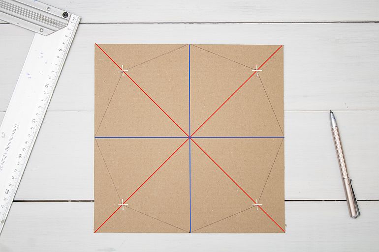1. Schneidet ein Quadrat aus Pappe mit jeweils 25 cm Seitenlänge zurecht. Daraus konstruiert ihr ein Achteck: Dafür verbindet ihr die gegenüberliegenden Ecken mit diagonalen Linien (rot eingezeichnet). Dort, wo sie sich schneiden, ist der Mittelpunkt des Achtecks. Dann zeichnet ihr eine waagrechte und eine senkrechte Linie ein, die durch diesen Mittelpunkt führen (blau eingezeichnet). Anschließend legt ihr das Lineal an die erste Diagonale an. Messt vom Mittelpunkt aus 12,5 cm ab und markiert den Punkt auf der Diagonalen. Das macht ihr mit beiden Diagonalen und in beide Richtungen, sodass ihr am Ende vier Punkte (als weiße Kreuze eingezeichnet) auf den Diagonalen markiert habt. Konstruiert daraus euer Achteck und schneidet es mit einem Cutter und einem Winkellineal aus.
